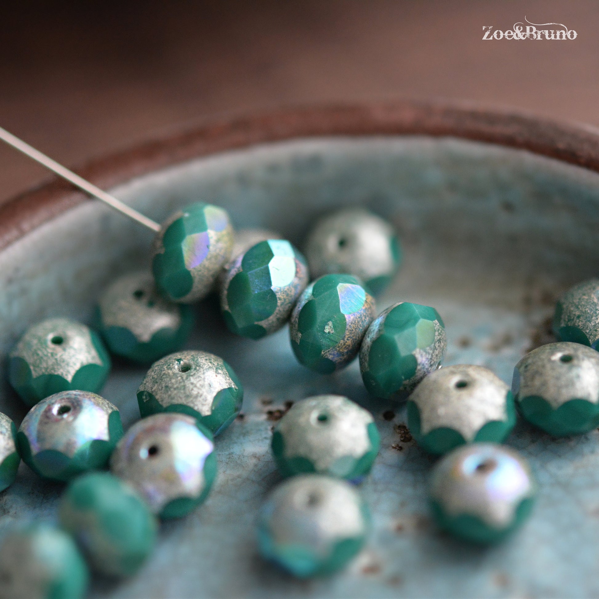 Czech glass, fire-polish rondelles, are in a magical opaque sea green, dusted with a slightly textured, metallic antique silver.
