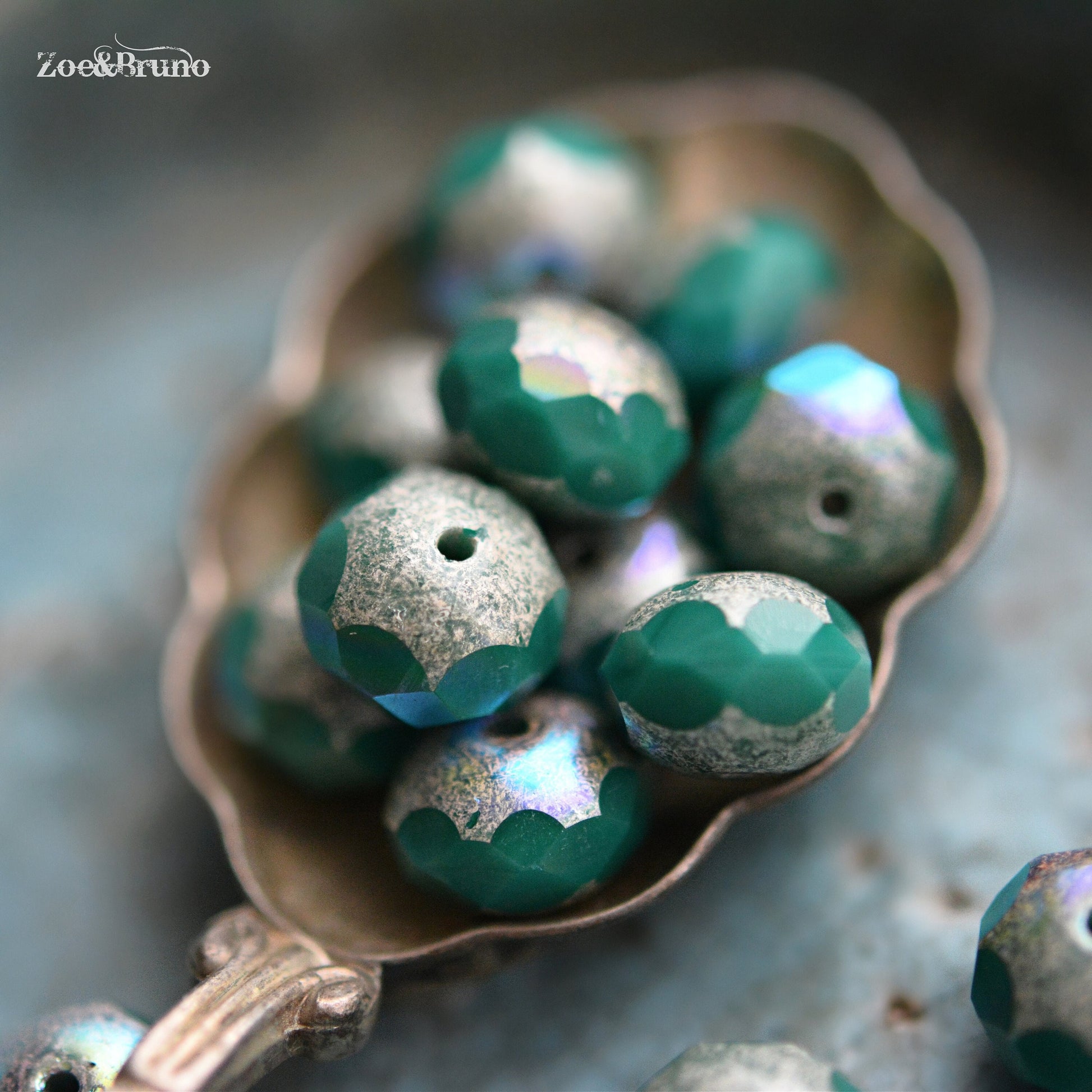10 Opaque Sea Green, Metallic Antique Silver Finish, AB Aurora Borealis, Premium Czech Glass, Facet Rondelle Beads 6x8mm