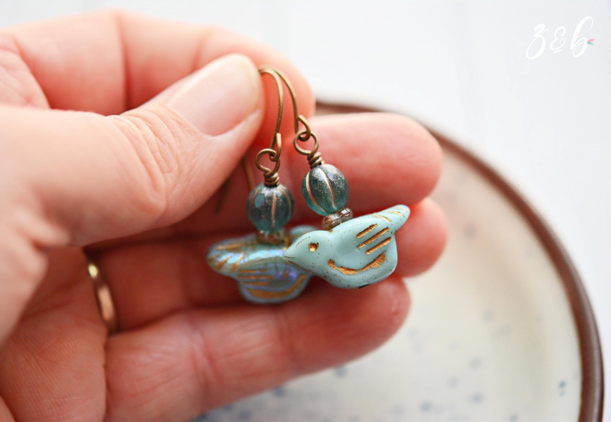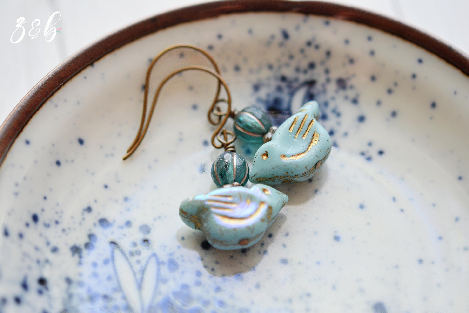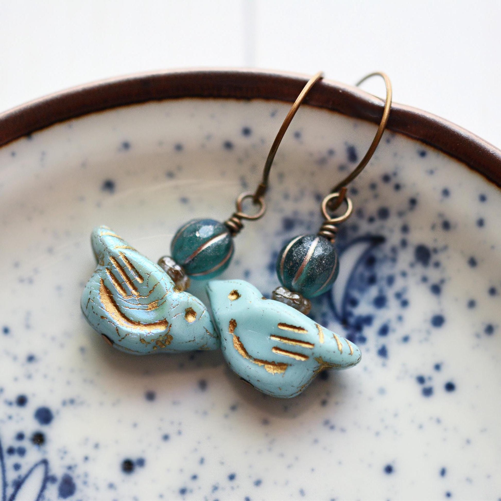 Czech glass opaque blue- green birds, have been paired with Czech glass champange flowers and magical teal blue, ribbed melon rounds. A touch of metallic on each bead gives these earrings a rustic and vintage inspired design. Each ray of beads has been wire wrapped and attached to round loop ear wires.